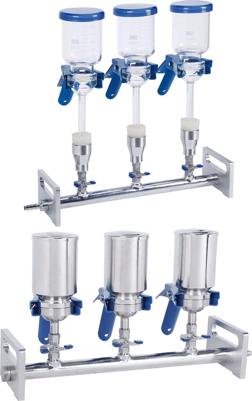 多聯(lián)過濾器專為多個樣品同時過濾而設計制造。目前,國內實驗室在對溶液進行過濾時,一般采用玻璃材質砂芯過濾裝置,這種方法每次只能過濾一個樣品,過濾速度慢,效率低,人工勞動強度大。對于需要同時過濾多個樣品的操作者,選擇使用多聯(lián)過濾器更為方便。由于它的每一個過濾架均有獨立的控制閥門,因此僅需用一個真空泵便可支持單聯(lián)或多聯(lián)同時操作。全不銹鋼材質的多聯(lián)過濾器支架可在180℃的高溫下進行過濾操作;鋁合金夾子設計合理緊密,可以方便地將濾杯與中間過濾頭合在一起并保證嚴格密封而不會漏液。同時316L衛(wèi)生級不銹鋼材質耐酸堿,耐腐蝕,易于高溫消毒,使分析結果更加穩(wěn)定可靠。